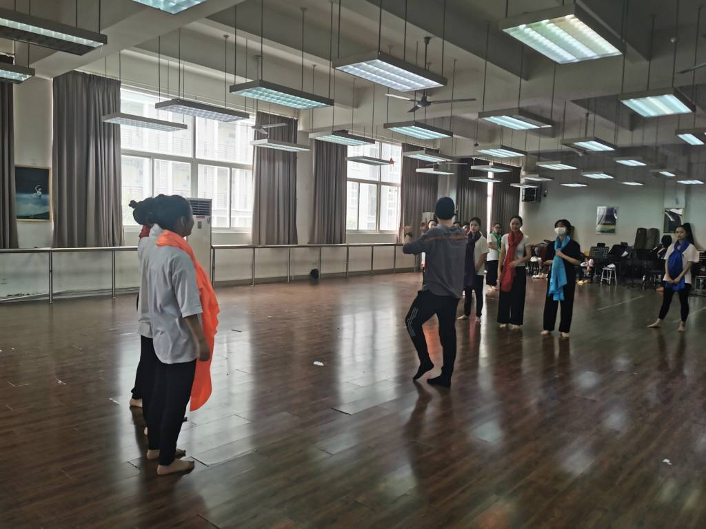 在排練中,為了讓學生能更好的理解與完成節(jié)目,排練老師積極配合導演,不斷的向學生講解節(jié)目所要表現(xiàn)的情感、寓意,啟發(fā)學生對每一個場景的刻畫、角色的塑造與動作的理解。排練中,老師親自示范,師生們一起在排練場上揮灑汗水。學生被排練老師的精神所鼓舞,排練場上,氣氛高昂。