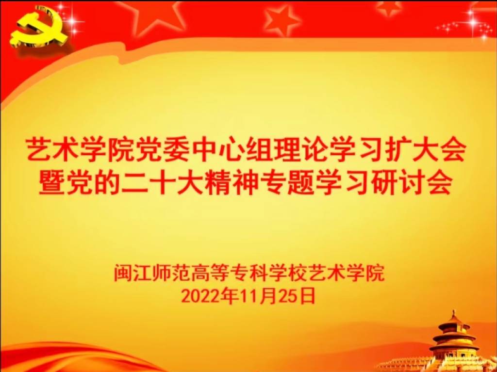 11月25日,藝術(shù)學(xué)院召開黨委理論學(xué)習(xí)中心組(擴(kuò)大)學(xué)習(xí)會(huì)暨黨的二十大精神專題學(xué)習(xí)研討會(huì),重點(diǎn)圍繞二十大報(bào)告中“實(shí)施科教興國(guó)戰(zhàn)略,強(qiáng)化現(xiàn)代化建設(shè)人才支撐”部分展開專題學(xué)習(xí)研討。藝術(shù)學(xué)院黨委理論學(xué)習(xí)中心組成員、中層以上干部、全體黨員參加會(huì)議,院黨委書記江柳青主持會(huì)議。