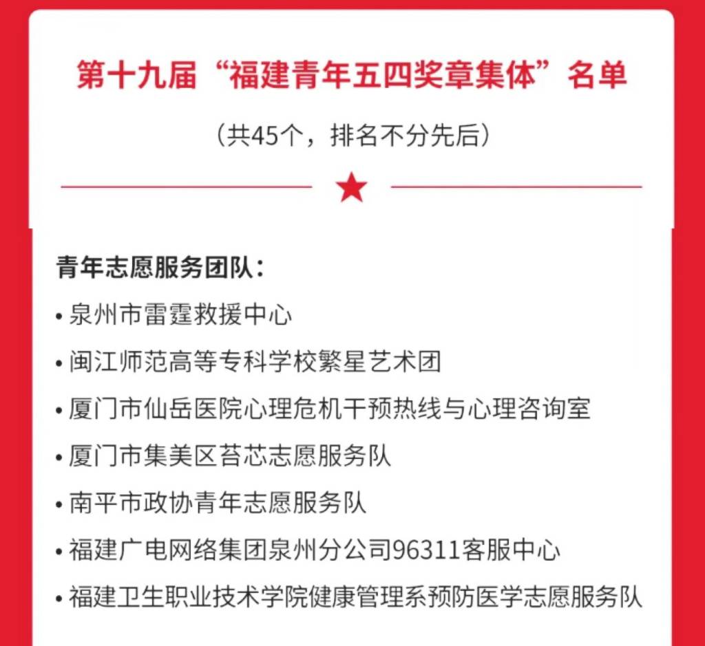 青春心向黨,建功新時(shí)代!在建團(tuán)百年之際,我院繁星藝術(shù)團(tuán)榮獲第十九屆“福建青年五四獎(jiǎng)?wù)录w”光榮稱號(hào)。