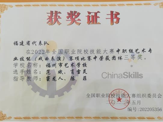 8月14日-8月20日,2022年全國(guó)職業(yè)院校技能大賽中職組藝術(shù)專(zhuān)業(yè)技能(戲曲表演)賽項(xiàng)在山東濰坊舉行。我校藝術(shù)學(xué)院(福州市藝術(shù)學(xué)校)戲曲表演(閩?。?zhuān)業(yè)學(xué)生范斌、肖雪靈代表福建隊(duì)與來(lái)自全國(guó)各職業(yè)院校代表隊(duì)的百余名優(yōu)秀學(xué)子同臺(tái)競(jìng)技,經(jīng)過(guò)基礎(chǔ)知識(shí)、唱念基本功法展示、做打基本功法展示和劇目表演等比賽各環(huán)節(jié)的激烈角逐,憑借出色表現(xiàn),最終榮獲團(tuán)體三等獎(jiǎng)。