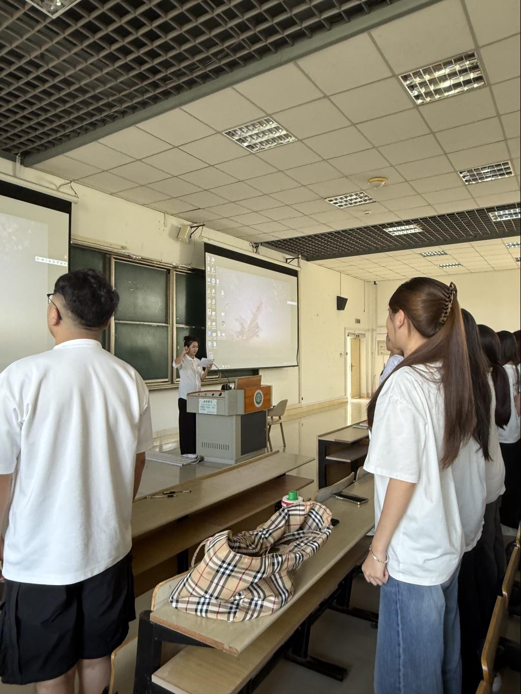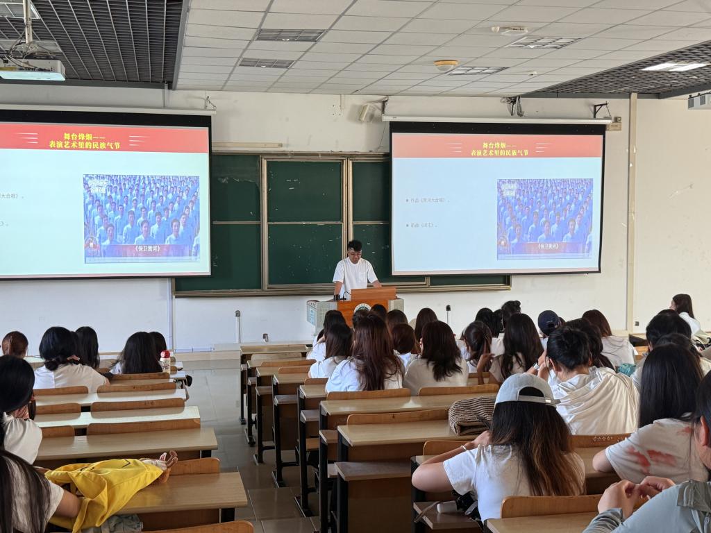 活動伊始,伴隨著激昂的《黃河大合唱》,同學(xué)們有序入場,沉浸式感受那段烽火歲月的厚重與莊嚴(yán)。團(tuán)課在嘹亮的團(tuán)歌聲中正式拉開帷幕。藝術(shù)學(xué)院團(tuán)委書記周宇航以“藝述烽火,鑄魂傳承”為題,帶來一場生動的主題報(bào)告。他從抗戰(zhàn)歷史的重大節(jié)點(diǎn)切入,結(jié)合鮮活事例,深刻闡釋了抗戰(zhàn)精神的時代價值,勉勵青年學(xué)子把愛國情、強(qiáng)國志、報(bào)國行自覺融入新時代奮斗征程?!皻v史從未遠(yuǎn)去,奮斗仍在繼續(xù)?!敝苡詈奖硎?,抗戰(zhàn)精神是中華民族彌足珍貴的精神財(cái)富,更是激勵青年勇?lián)姑㈨频Z奮進(jìn)的強(qiáng)大動力。他希望同學(xué)們以史為鑒,把紅色基因轉(zhuǎn)化為志愿服務(wù)的實(shí)際行動,在奉獻(xiàn)社會中書寫無悔青春。