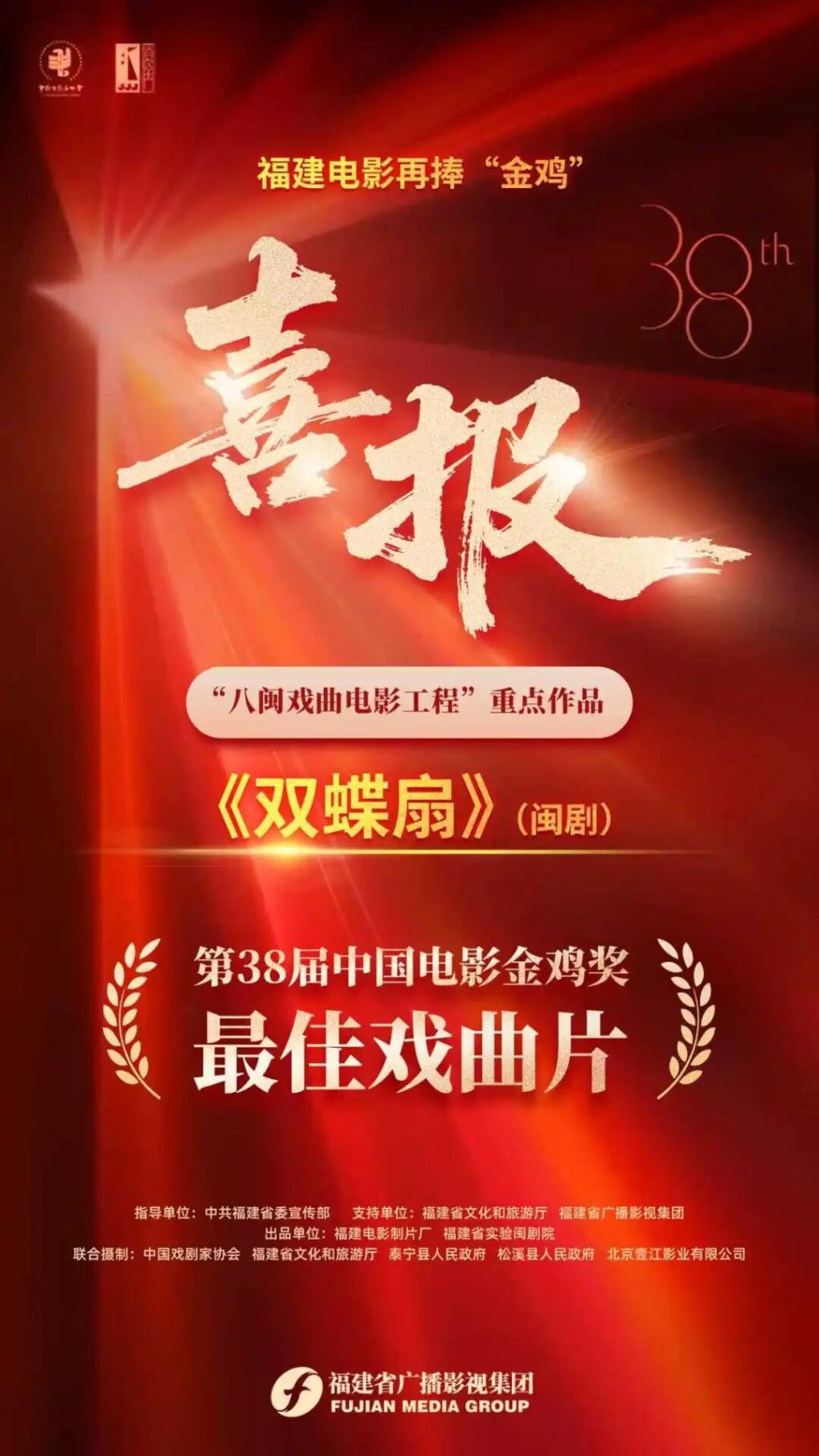 由中共福建省委宣傳部指導(dǎo),福建省文化和旅游廳與中國戲劇家協(xié)會、福建省廣播影視集團(tuán)聯(lián)合攝制,福建省實(shí)驗(yàn)閩劇院與福建電影制片廠有限公司共同出品,我校藝術(shù)學(xué)院副院長、一級演員、中國戲劇“梅花獎”得主陳洪翔,中國戲劇“梅花獎”獲得者、一級演員周虹及江忠?guī)r領(lǐng)銜主演的閩劇電影《雙蝶扇》,在第38屆中國電影金雞獎中喜獲“最佳戲曲片”大獎,實(shí)現(xiàn)福建戲曲電影金雞獎零的突破!