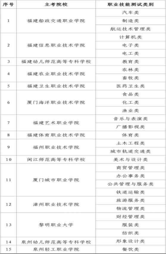 2024年福建省高職院校分類考試招生職業(yè)技能測(cè)試主考院校名單